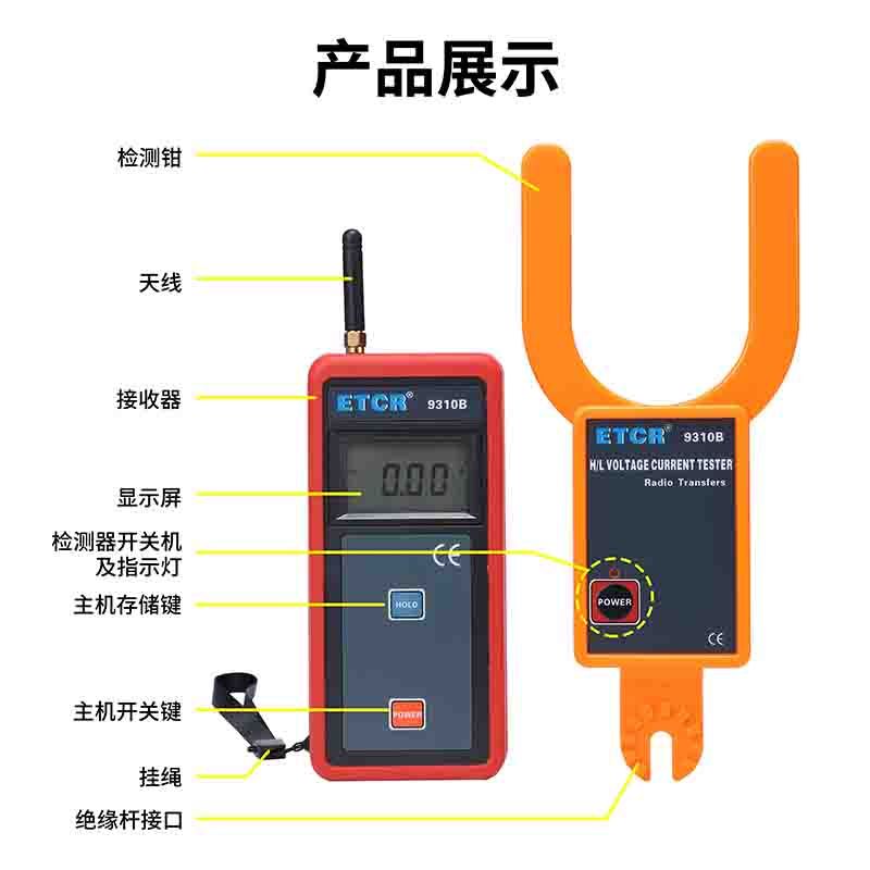 品牌:ETCR 型号:ETCR9310B 加工定制:是 类型:数字式 测量范围:AC 0.00A~9999 A 外形尺寸:钳口尺寸:Φ68 mm 无线传输距离:100m ETCR9310B大口径叉形无线高低压电流表又称U形高低压钳形电流表,架空线路负载测试仪,高压负载测试仪、高空电流测试仪、高压电流遥测仪,用于110kV以下架空线路高低压交流电流测量。独特的U型开口结构实现了无阻碍测量,现场测试特别方便。广泛应用于变电站﹑发电厂﹑工矿企业以及检测站﹑电工维修部门进行电流检测和野外电工作业等。