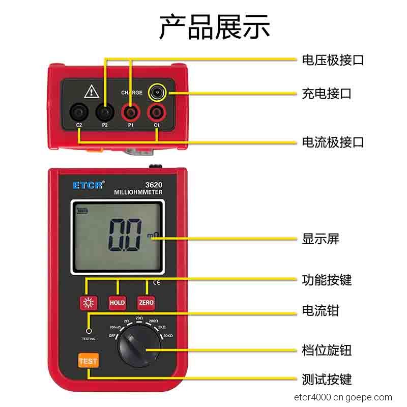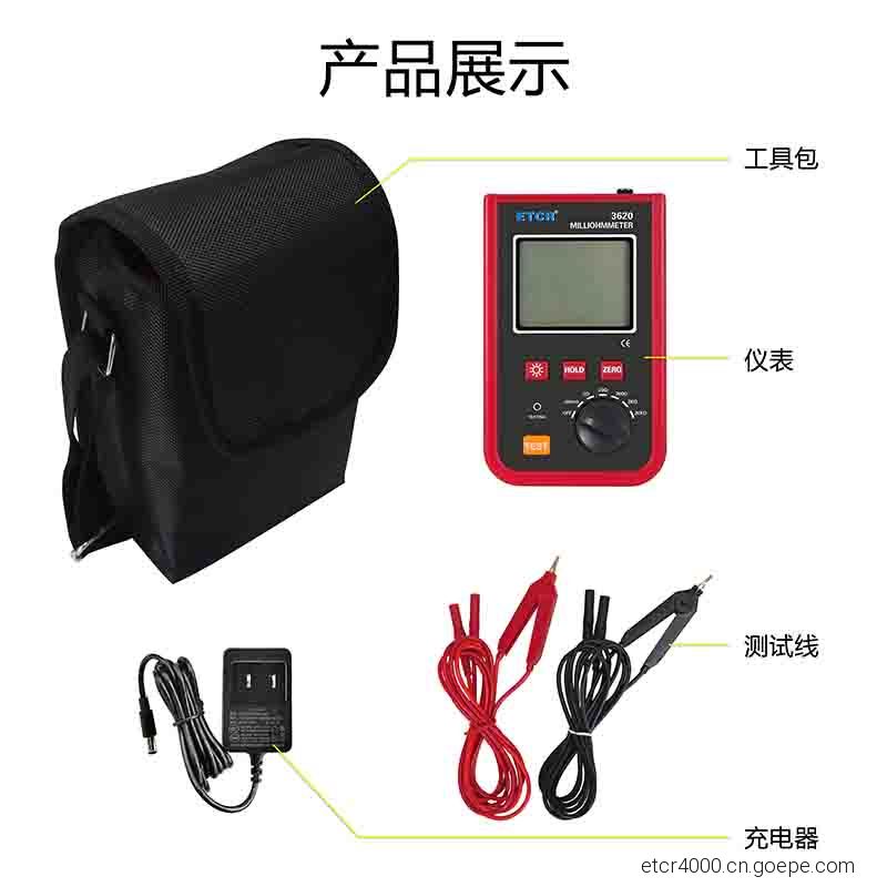 品牌:ETCR 型号:ETCR3620 加工定制:是 测试电阻:1mΩ~20.0kΩ 测试精度:0.1mΩ 外形尺寸:主机尺寸:159×100×66 mm ETCR3620便携式毫欧计又称直流低电阻计、直流电阻测试仪,欧姆计,主要用于测量电缆的导线电阻,开关、接插件、继电器的接触电阻,线圈、电动机、变压器绕组的直流低电阻,金属铆接件金属构件之间,地网地极连接导体间的联接电阻。仪表广泛应用于工矿企业、建筑监测监理公司、建筑施工单位、防雷公司、电力部门、船舶机车厂等
