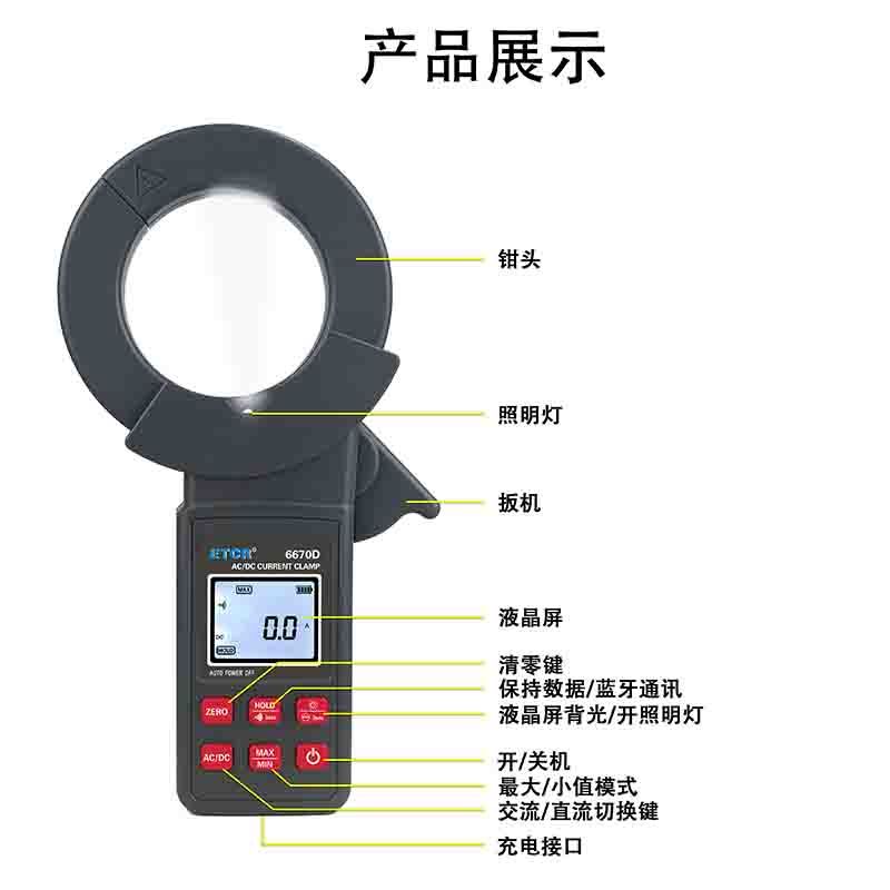 ETCR6670D大口径直流/交流钳形电流表钳表具有直流/交流真有效值测量、*大值/*小值/平均值测量等功能。钳表具有数据保持、蓝牙通讯功能,使用大容量锂电池type-c充电口,是一款新型的电工安全检测必备工具。