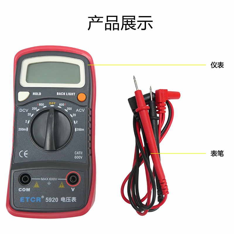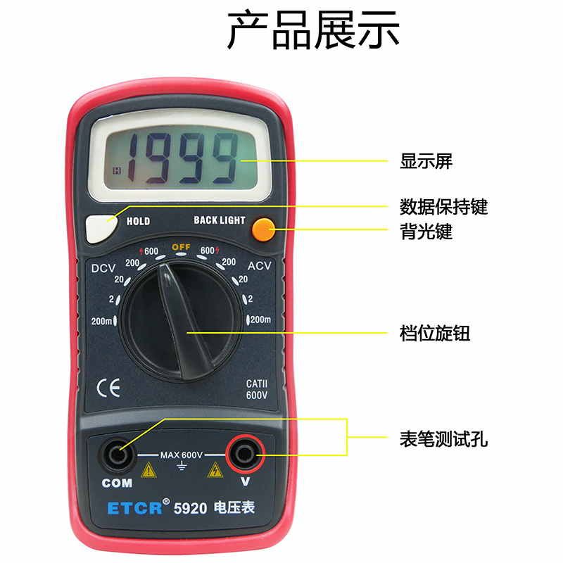 ETCR5920数字电压表设有背光源,方便用户在黑暗的场所读出测量值。