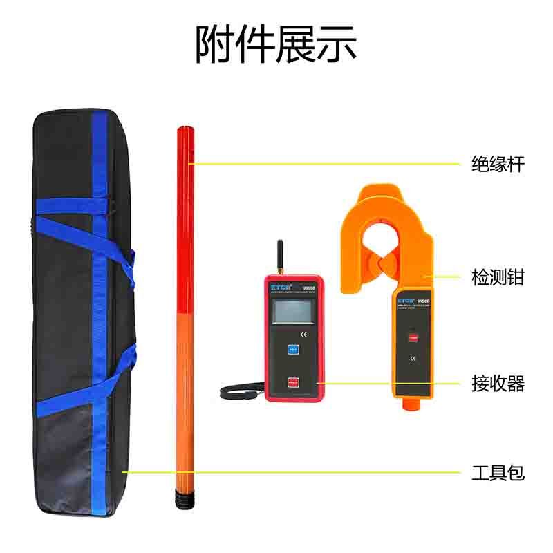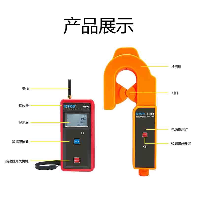 ETCR9150B无线高低压钳形电流表由钳头、接收器、绝缘杆组成,钳头与接收器无线通讯距离30m。钳头与引导区创新的一体化设计,通过按压或退拔绝缘杆能快速方便钳夹或撤离被测导线,安全快捷。仪表还具有数据保持、数据存储等功能。