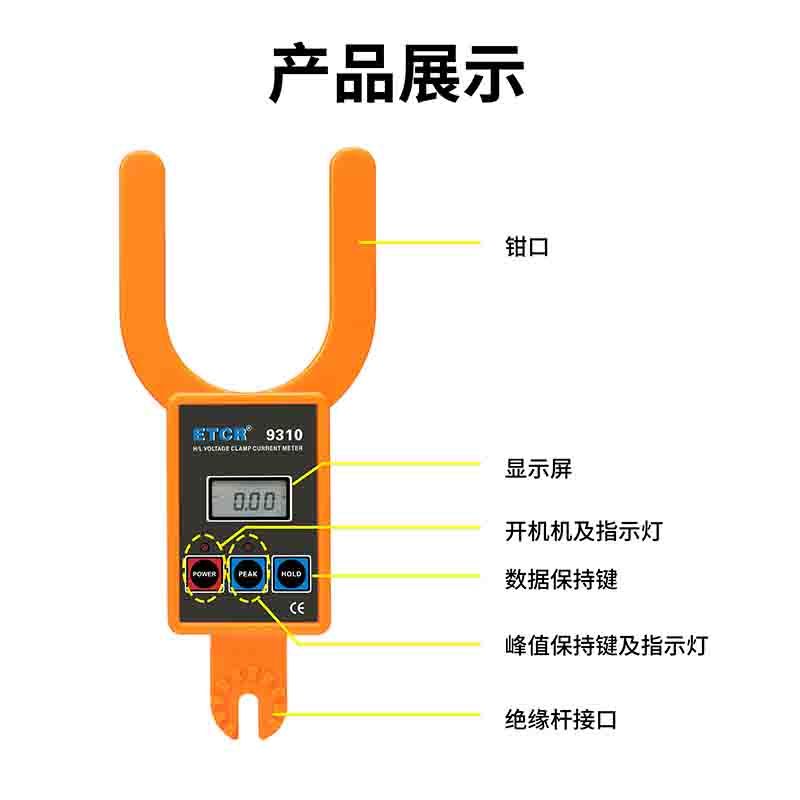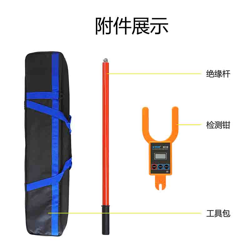 ETCR9310大口径高低压叉形电流表由专用大口径叉形电流表配高压绝缘杆组成。用于110kV以下测试需带绝缘杆操作,在600V以下可不使用绝缘杆,直接使用叉形电流表测试。,仪表还具有数据保持、数据存储等功能。