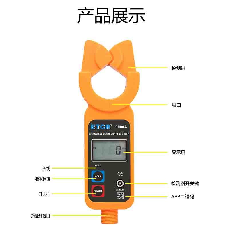 ETCR9000A蓝牙版高低压钳形电流表钳头与引导区创新的一体化设计,通过按压或退拔绝缘杆能快速方便钳夹或撤离被测导线,安全快捷。仪表还具有峰值保持、数据保持、数据存储、蓝牙通讯等功能。